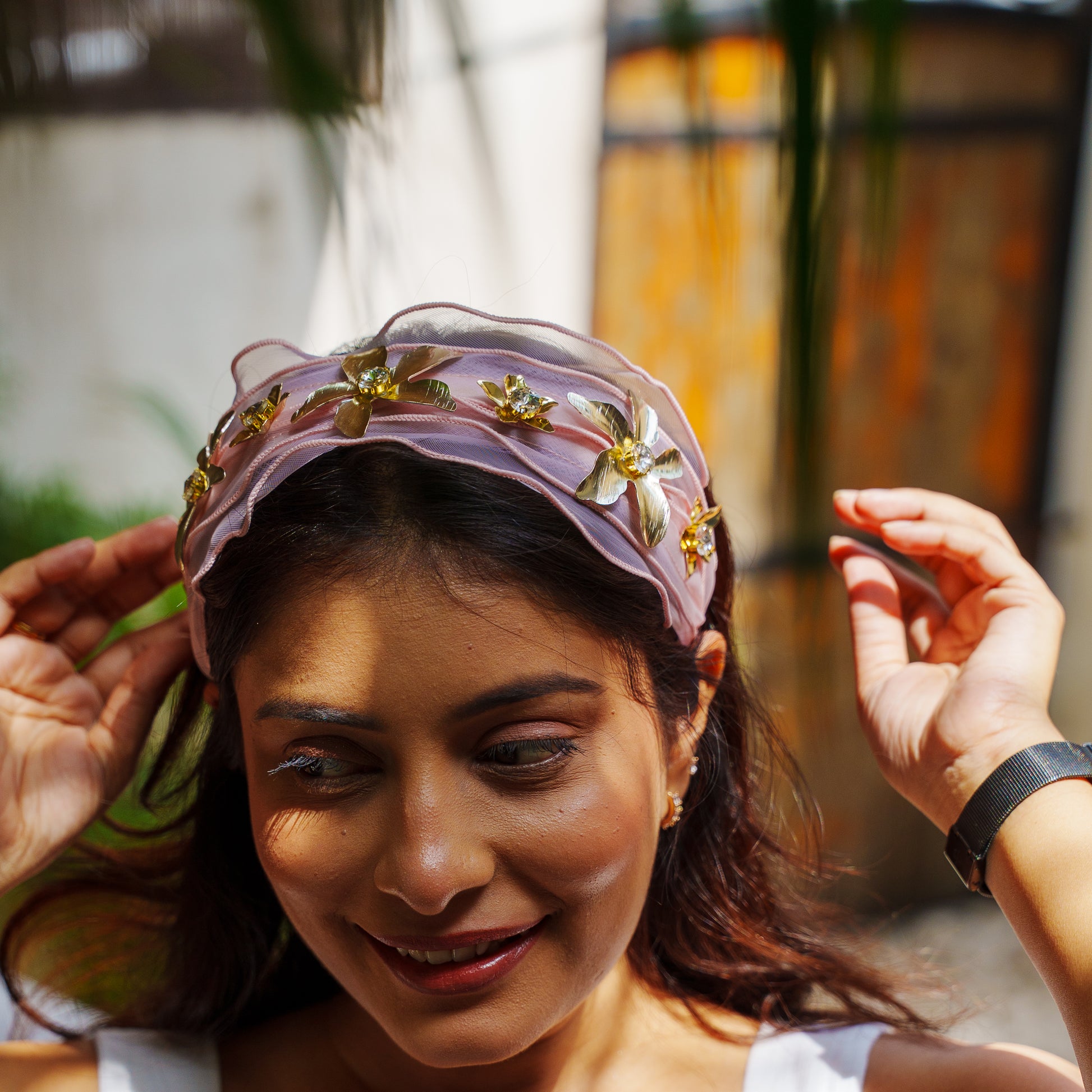 This Pink soft Organza headband features a flowy design adorned with sparkling Gold & diamond metal flower, adding a touch of sophistication to any outfit. Perfect for casual, formal, and festive looks.
