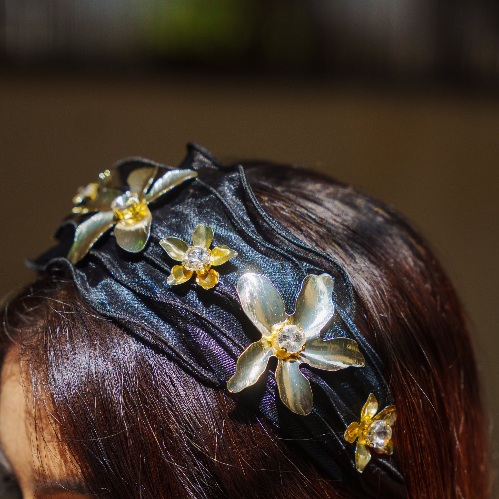 This Pink soft Organza headband features a flowy design adorned with sparkling Gold & diamond metal flower, adding a touch of sophistication to any outfit. Perfect for casual, formal, and festive looks.