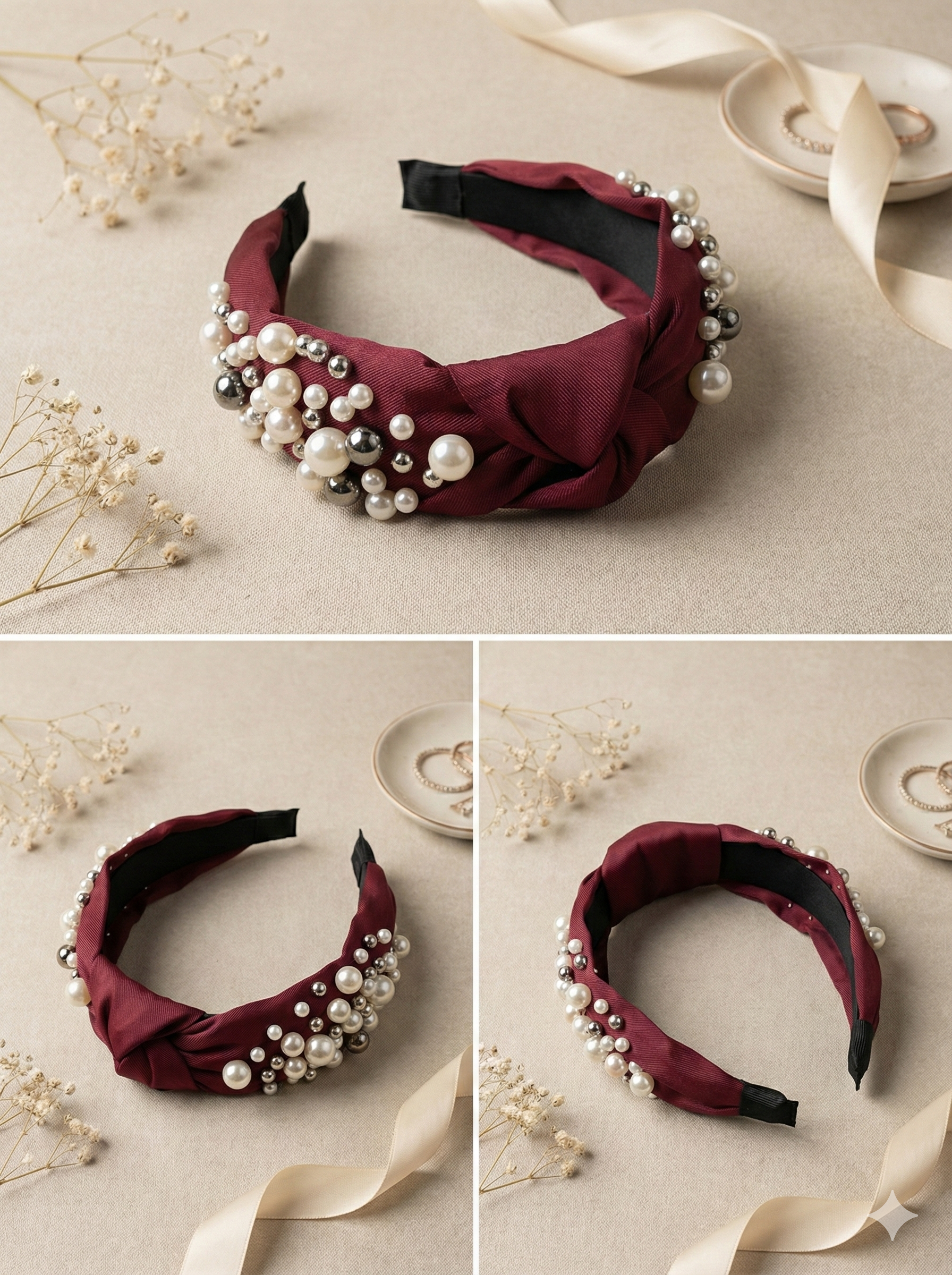 Hair Accessory : These satin headband features a knotted design adorned with sparkling rivetted pearls, adding a touch of sophistication to any outfit. Perfect for casual, formal, and festive looks.