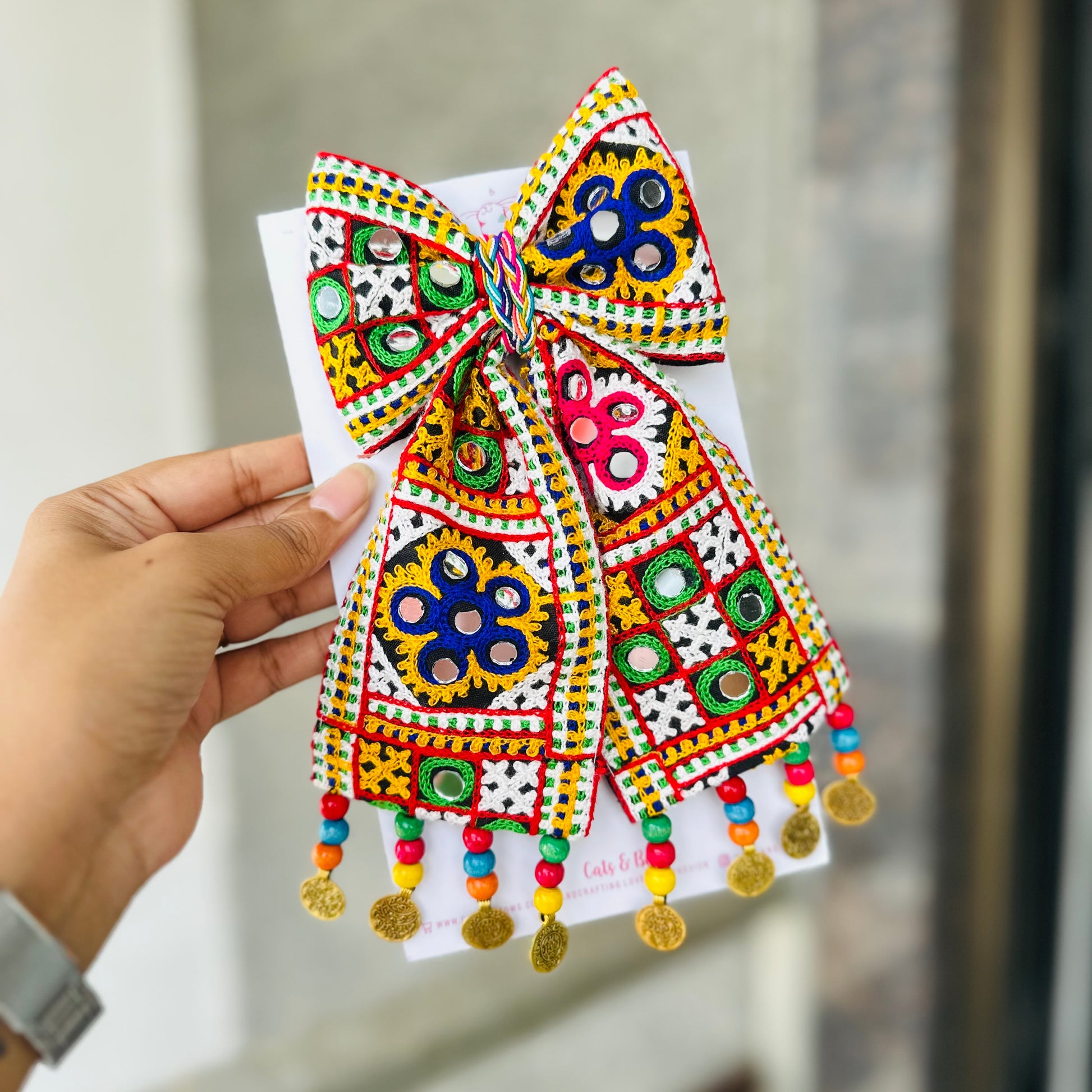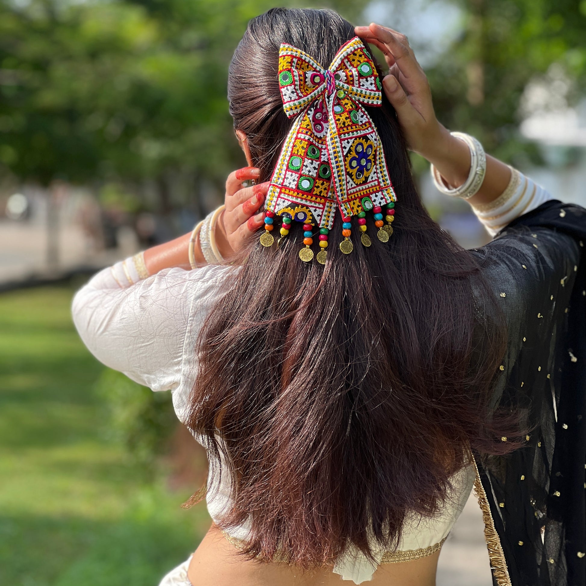 Crafted with love and care by local women artisans, these limited-edition bows showcase intricate details that celebrate the spirit of Navratri. Designed to be versatile, they can be clipped on a half pony , a braid or a bun hair style to ooph up your hair do . These Navratri bows are both functional and fashionable. Get ready to dance the night away with your new favorite hair accessory!